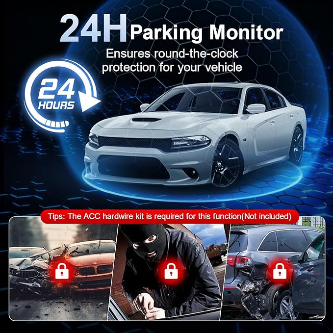 - [24/7 Parking Protection, G-Sensor & Super Night Vision] G-sensor locks critical footage on impact detection to avoid overwriting during loop recording, preserving accident evidence.Premium aperture, CMOS sensor, 170°wide-angle lens and low-light tech capture details like license plates in dim conditions. Parking monitoring auto-activates on collision/theft, recording key moments for 24/7vehicle protection. (*Hardwire kit required)