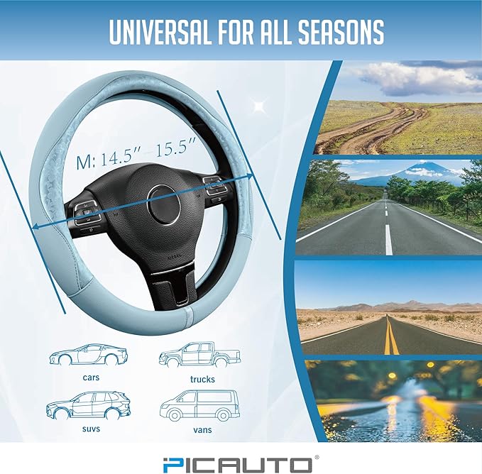 - UNIVERSAL SIZE - Perfect Fit for Most Steering Wheels: Engineered to fit standard steering wheels ranging from 14.5” to 15.5” in diameter, this universal-fit cover is ideal for most sedans, SUVs, trucks, and crossovers. It's a must-have upgrade for your steering wheel protection and style.