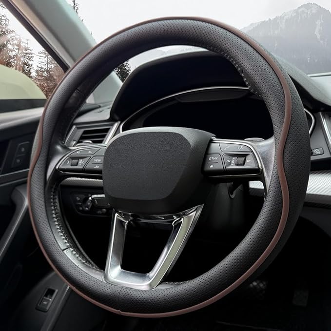 Leather Steering Wheel Cover, with Anti-Slip Stripe Design - Enhanced Grip, Fashion Style, Safe, Non-Slip, Breathable. Upgrade car Interior,Black Brown