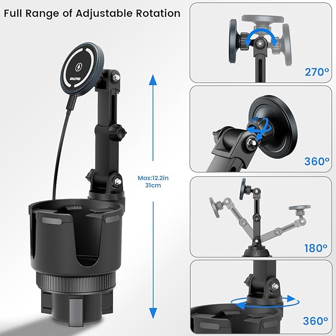 - 【Large Cup Base – Family & Road Trip Ready】The expandable base fits most vehicle cup holders and is designed to hold large water bottles or tumblers alongside your phone. Perfect for road trips, family vehicles, or parents traveling with kids, this cup holder phone mount with magsafe charger keeps essentials organized and phones charged.