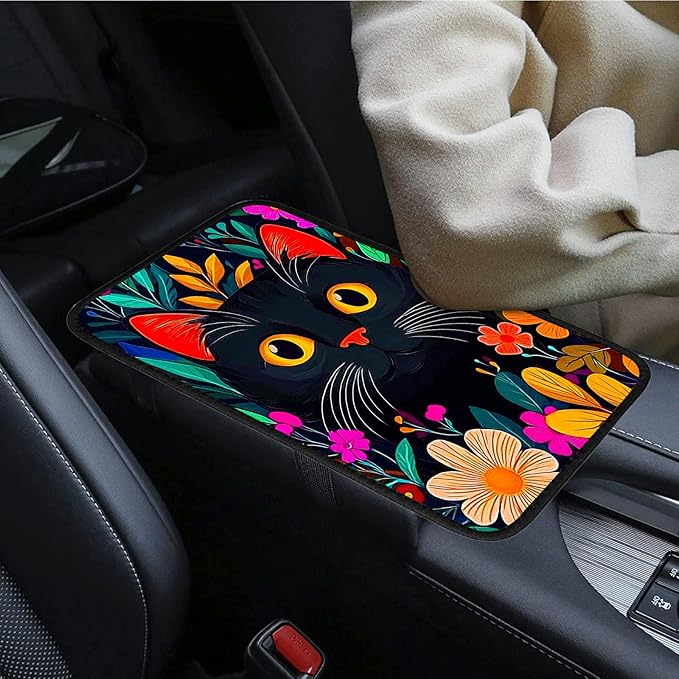 Universal Auto Center Console Pad and 2Pcs Car Coasters Set, Anti Slip Soft Neoprene Car Armrest Seat Box Cover Protector for Most Vehicle - Car Interior Accessories, Wildflower Black Cat