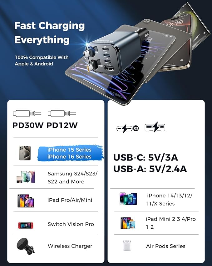 - [Universal Fast-Charging Compatibility] The iPhone car charger supports PD, QC3.0, AFC, MTK, and FCP fast-charging protocols, working with phones, tablets, smartwatches, Nintendo Switch, and more. The dual retractable USB-C cables provide flexible fast-charging options for iPhone 17/16/15 series, iPad, Samsung, Google Pixel, and Android devices, while the USB-C and USB-A ports work seamlessly with iPhone X~14, AirPods, and other common accessories.