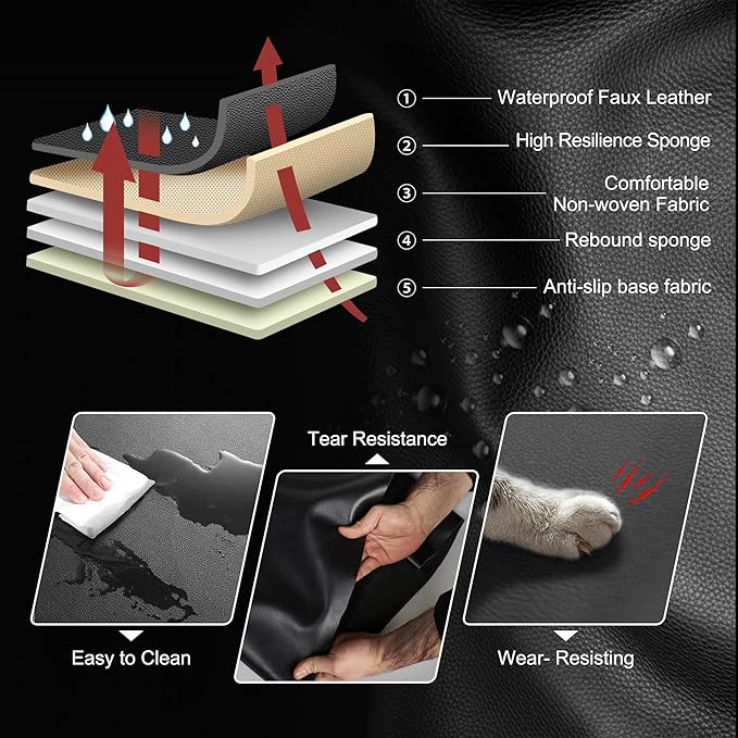 - 【Leather Material】Faux leather seat covers is waterproof and color long-lasting against rain,spills and sweat,so you don't have to worry about water stains and fading.Cleaning is also easy,just wipe off with some detergent and a towel.