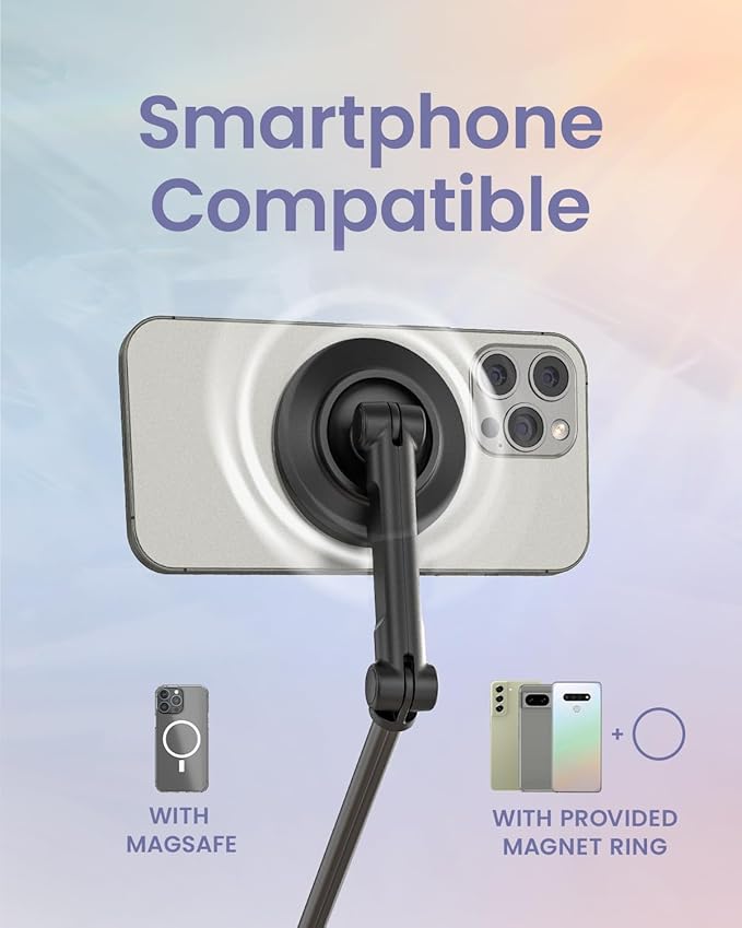 - Strong Magnetic Phone Mount: Equipped with strong N52 magnets for secure, clamp-free attachment. This MagSafe tripod perfectly fits iPhone 12/13/14/15/16/17 series (including Pro, Max, and Mini),Pixel 10 Pro, delivering a smooth snap-on experience every time. Includes metal rings for Android phones and non-MagSafe cases.
