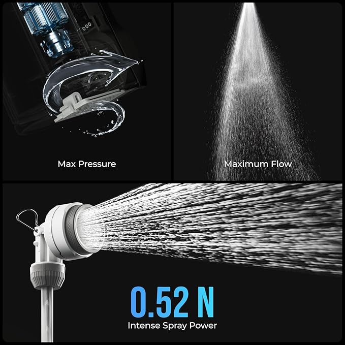 - Powerful & Long-Lasting Performance – Equipped with a high-capacity rechargeable battery, the built-in electric pump delivers up to 35 mins on high mode or 70 mins on low mode, ensuring ample shower time. The 2.2m long hose provides flexibility, while the strong water pressure mimics a home-like shower experience, even in the wild.