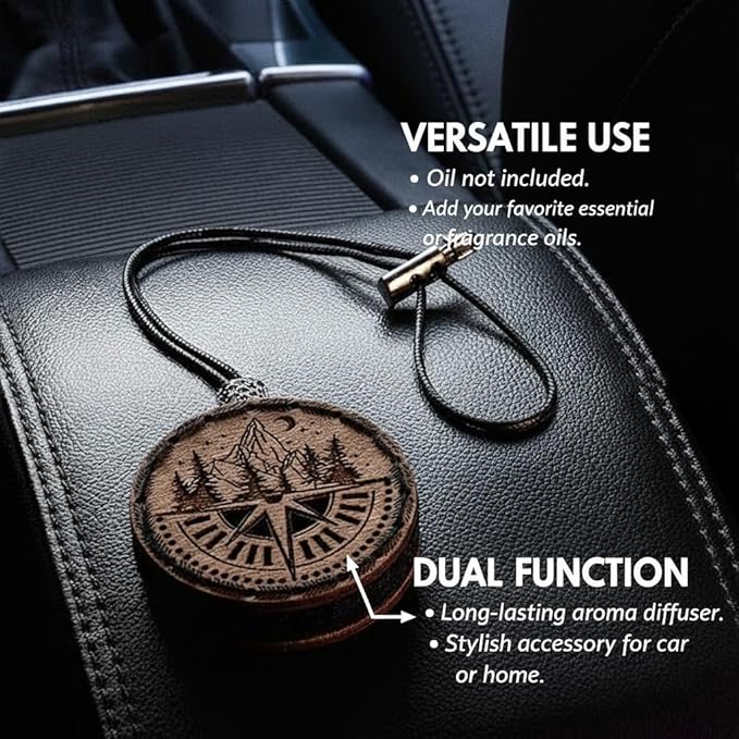 Wood Car Air Freshener — Compass Mountains — Handmade Unscented DIY Essential Oil Hanging Diffuser with Felt Insert — Add Your Own Oils — Refillable — Car/Truck/SUV — Cardboard Box