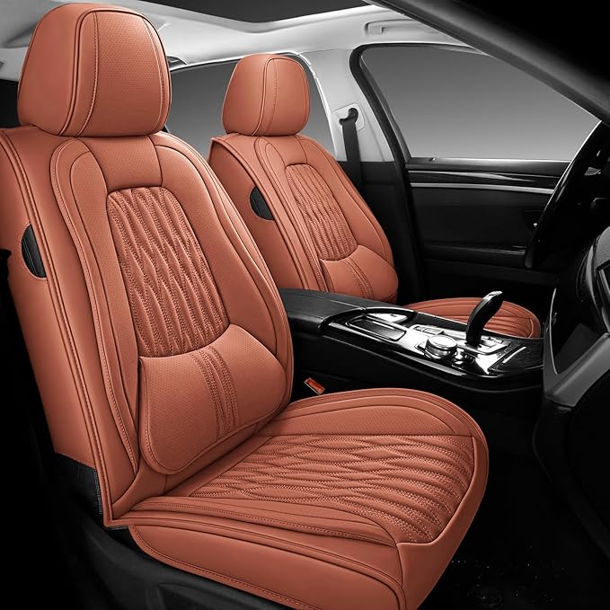 WELLDO Car Seat Covers Full Set, Premium Nappa Leather Seat Covers for Car, Waterproof Car Seat Protector with Lumbar Support, Automotive Seat Covers Universal Fit for Most Cars SUV Truck, Brown