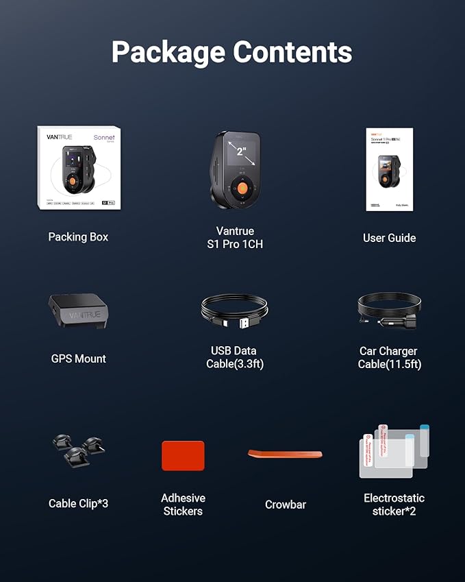 - [ 1440P@60FPS Ultimate Clarity] The Vantrue S1 Pro front dash cam turns your drive into a high-definition experience. Record in fluid 1440P at 60 FPS or high-resolution 2.7K to capture impeccable details in any lighting. With its true 158° wide-angle lens, you get a cinema-like view of your journey, leaving no blind spots and ensuring total peace of mind on the road.