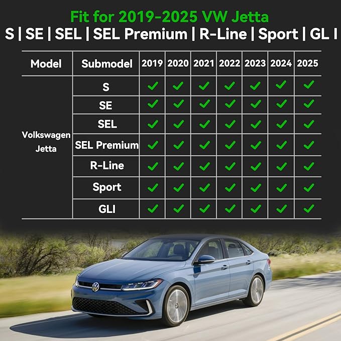 - Custom Fit: Floor mats fit for Volkswagen Jetta 2025 2024 2023 2022 2021 2020 2019. Includes 2 front floor mats & 1 rear floor mat & 1 cargo liner. If creases are caused by transportation, please put the mats in the sun for a while or blow them with a hair dryeries