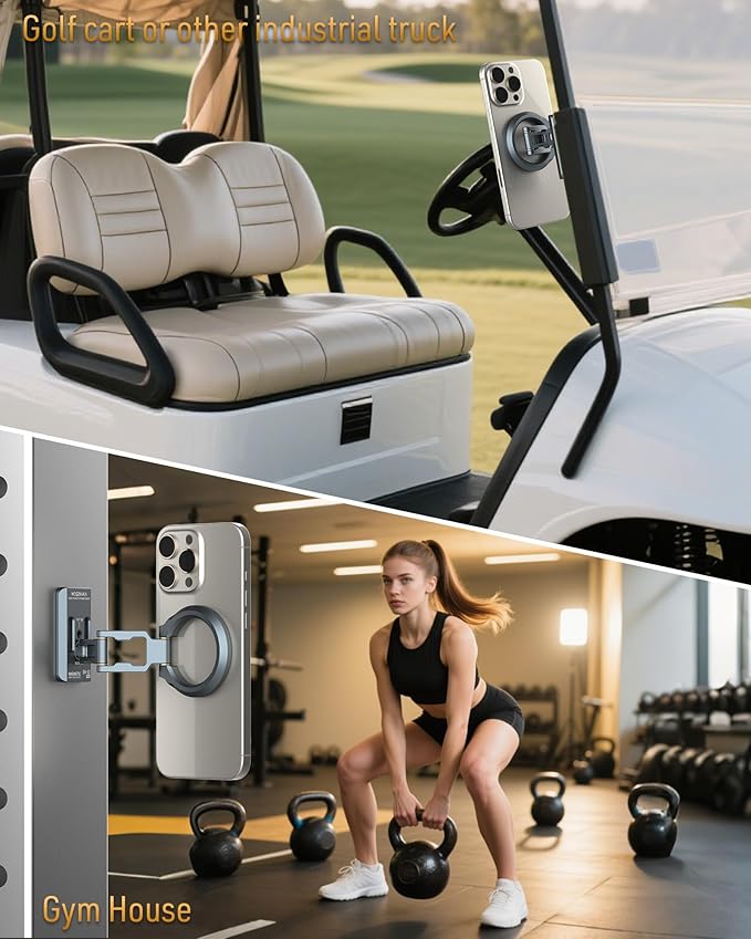 - 【Multi Scenario Use】The dual-sided magnet design makes this gym phone stand truly versatile. It's not just for your desk, you can use it as a car mount for your car, and you also can use it while working out(gym magnetic phone holder), driving a golf cart(Magnetic Golf Cart Phone Holder ), or anywhere with ferrous surfaces.