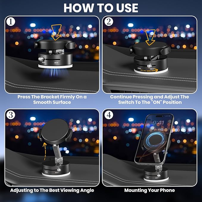 - 360° Rotation & Dual-Axis Adjustment: This vacuum magnetic phone holder features a 360° rotating base and 210° dual-axis folding metal arms, allowing easy angle adjustments to suit your needs. Whether in the car or at the office, switch between portrait and landscape modes effortlessly. Its unique folding design reduces the mount's size by 50% when not in use, keeping your space tidy. Tested over 3000 times for durability, it remains stable and reliable for long-term use