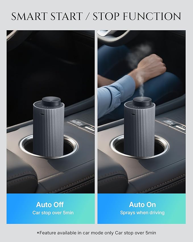 - 2-IN-1 HOME & CAR MODES: This waterless diffuser effortlessly switches between home and car modes—press and hold the gear button for 3 seconds, then release to switch modes and enjoy the fragrance. In car mode, it senses vibrations to automatically release scent mist , and after 5 minutes of parking, it enters sleep mode to conserve essential oils