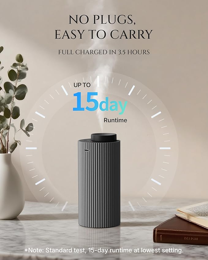 - CONVENIENT BUTTON OPERATION: Press and hold the diffuser's power button for 3 seconds, then release to instantly release fragrance—no complicated setup required. Charge via Type-C port for just 3 hours to enjoy up to two weeks of continuous use. This portable diffuser perfectly accommodates 20ml essential oil bottles. (Essential oils sold separately). Perfect as essential oil diffusers for home—exactly what you need for easy, on-the-go aromatherapy