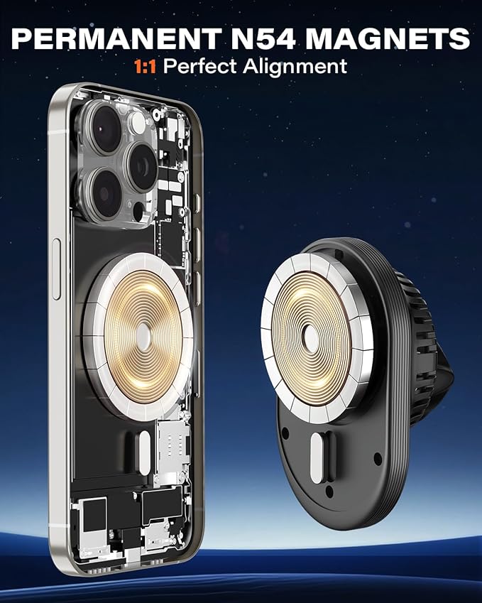 - Super-Strong N54 Magnet for a Secure Hold: Engineered with an upgraded N54 neodymium magnet array, this mag safe car mount delivers 1.6 kg (3.5 lbs) of magnetic force—strong enough to keep your iPhone securely attached, even on bumpy roads.