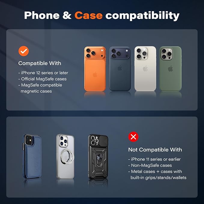 - Case Compatible & Safe Charging: This magnetic car charger has been rigorously tested to meet our advanced safety standards and is designed to safely charge your phone even through a MagSafe compatible case (up to 3mm).