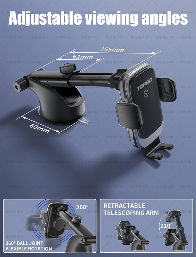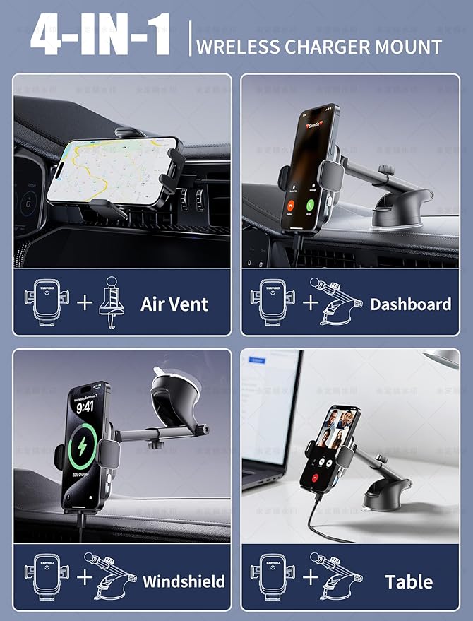 TOPGO Dashboard Wireless Car Charger, Universal Cell Phone Holder, Wireless Charger Phone Holder, 15W Fast Charging for iPhone 17 Pro Max, Samsung Galaxy - Black