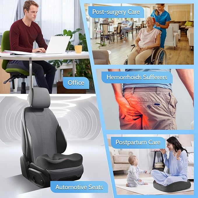 - 【Innovative Design Donut Pillow】:After researched the traditional donut pillow and hemorrhoid pillow, This new style donut cushion retaining the advantages of classical design in Scientific Center Hole & Coccyx Cutout, this hemorrhoid pillows for sitting seat cushion come with two humps hip curve and leg curves ergonomically designed, so it can keep donut pillows traditional functions and bring more comfortable experience when you sitting on this butt pillow, we suggest you can take this doughnut pillow as one hemorrhoid pillow, also as one coccyx cushion for tailbone pain, etc
