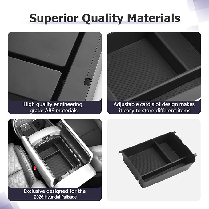 - High-quality Material β This 2026 Palisade accessories,Palisade accessories 2026,2026 Palisade armrest storage box is made of ABS plastic. 2026 Palisade center console organizer is very strong and can be a good independent armrest box while you are driving. Palisade accessories 2026 is also moisture-proof and resistant. Corrosion and durability