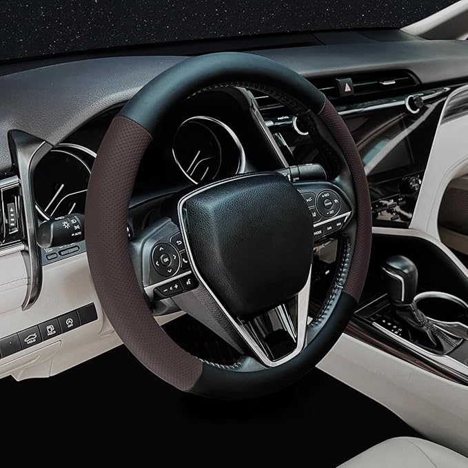 Steering Wheel Cover Standard Size 14.5-15 inch, Non-Slip Car Wheel Cover Protector, Breathable Microfiber Leather, Black and Chocolate Brown