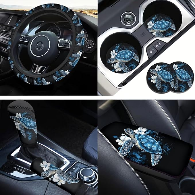 Blue Sea Turtle Steering Wheel Cover Sets Flower Print Car Accessories Handbrake Cover Cup Coaster Car Interiors Decor for Men Women 6pcs
