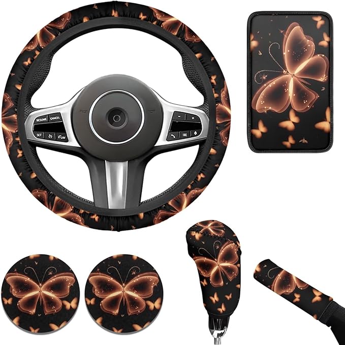 Butterfly 6pcs Car Steering Wheel Cover Sets Yellow Car Accessories for Men Women Cup Holder Handbrake Gear Cover for SUV Truck Sedan