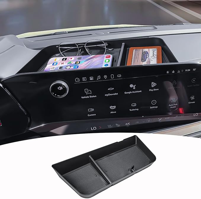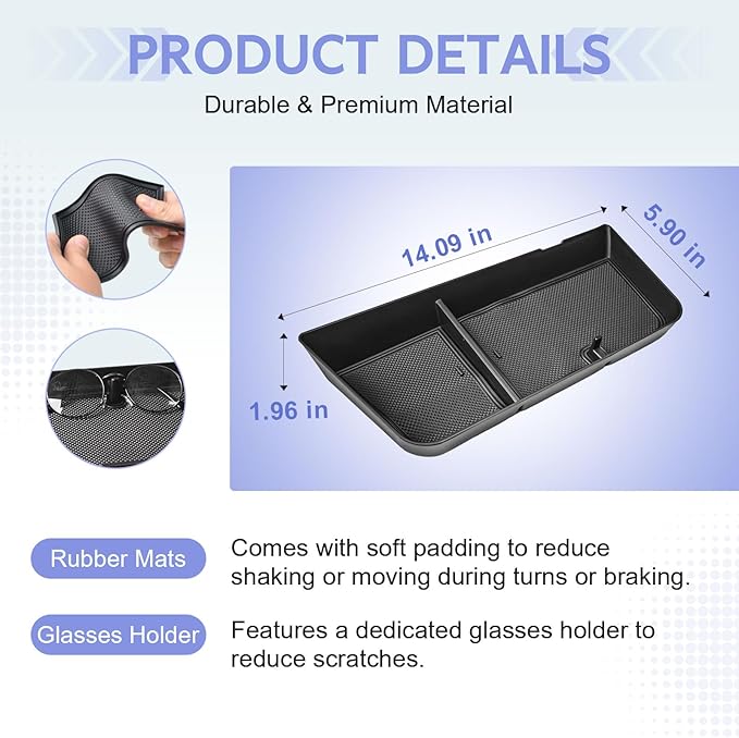 - Durable & Premium Material โ Constructed from black ABS plastic with soft rubber mats, the organizer reduces items from sliding. Designed to sit seamlessly behind the 17.7-inch touch screen and hold your everyday driving essentials.