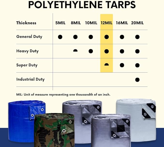 - HIGHLY DURABLE: With 12 mil thick polyethylene, this extra strong tarpaulin can be used for almost anything; cover equipment & machinery, construction sites, painting or furniture covers