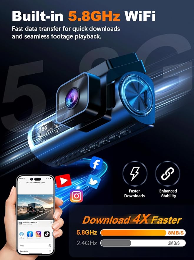 - 【High-Speed 5.8GHz WiFi & Integrated GPS with App Control】Featuring advanced 5.8GHz WiFi and a free mobile app, this dash camera supports video downloads at speeds of up to 8MB/s—four times faster than 2.4GHz—greatly reducing transfer times and playback lag. The built-in GPS accurately records your speed, driving route, and real-time location (latitude and longitude), which you can view on maps using the app or our GPS Player for Windows and Mac.