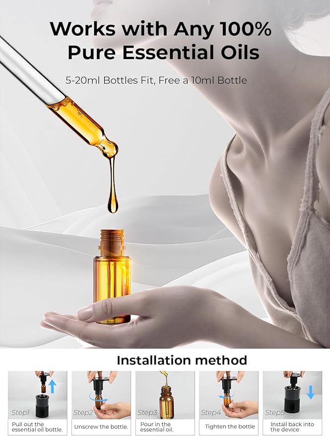 - Universal Bottle Compatibility: The diffuser diffusers for home simply screw on any standard 5mL to 20mL essential oil bottle directly onto the nozzle, or use the included bottle for decanted oils
