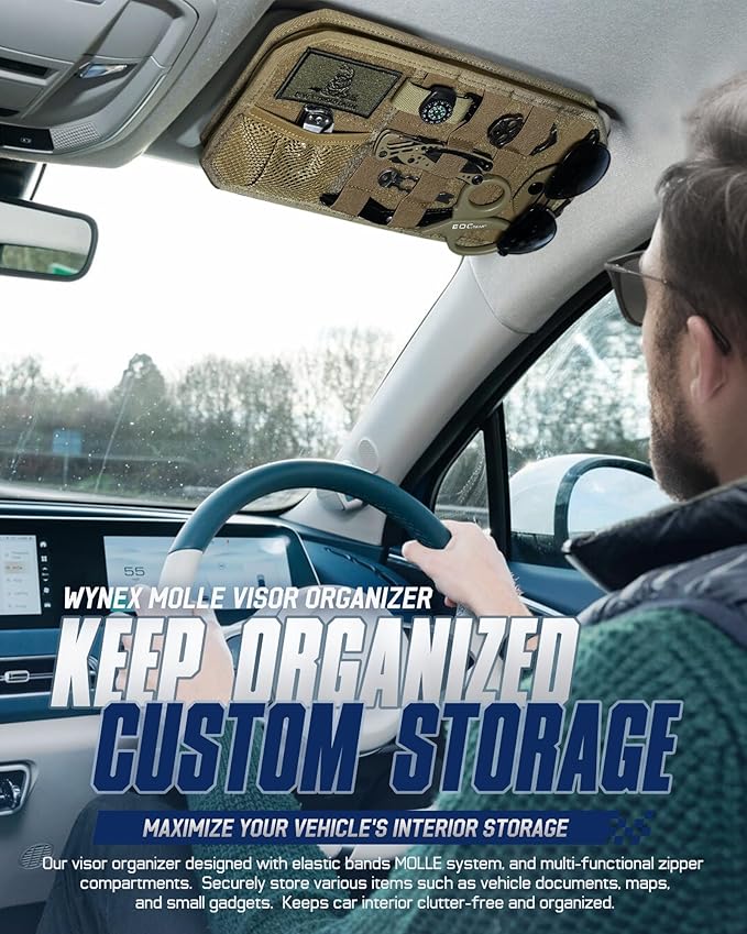 WYNEX Molle Car Sun Visor Organizer, Original Design Car Accessories with Zipper Visor Storage Pouch & Glasses Clip, Semi-Rigid Molle Panel for Tactical Gears, Fits Most Vehicles, SUVs, Trucks