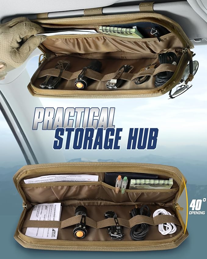 - Car Enthusiast's Dream : Versatile car visor organizer ideal for outdoor buffs, commuters, and professionals alike. Stores tactical gear, emergency supplies, and car insurance info. Whether you're on a cross-country road trip, camping adventure, or running daily errands, stay prepared for every journey.