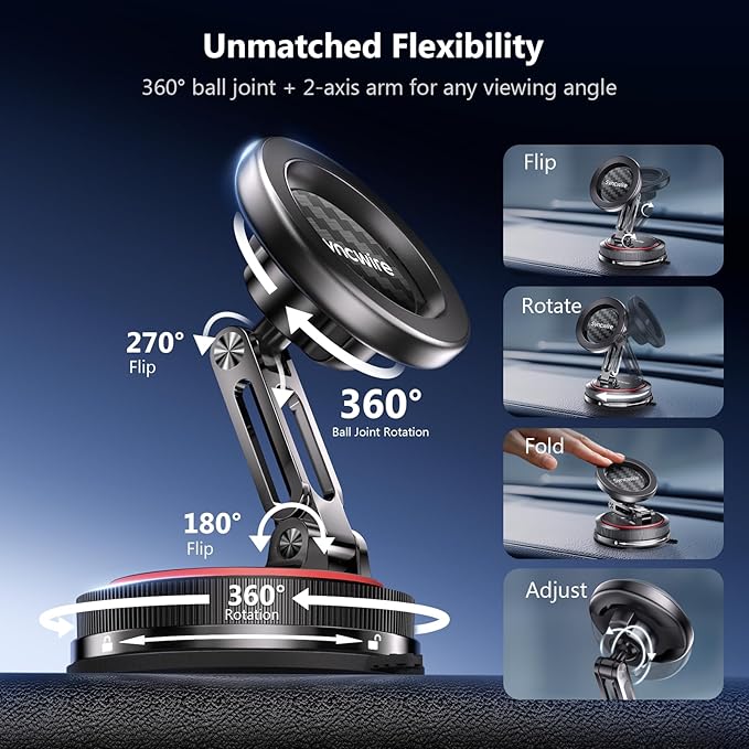 - [Fully Adjustable with Foldable 2-Axis Arm] Features a 360° rotatable base, dual-axis foldable arm, and detachable magnetic ball joint to freely adjust your phone to any angle. Folds down to reduce the mount size by 50% when not in use - perfect for keeping your car interior tidy.