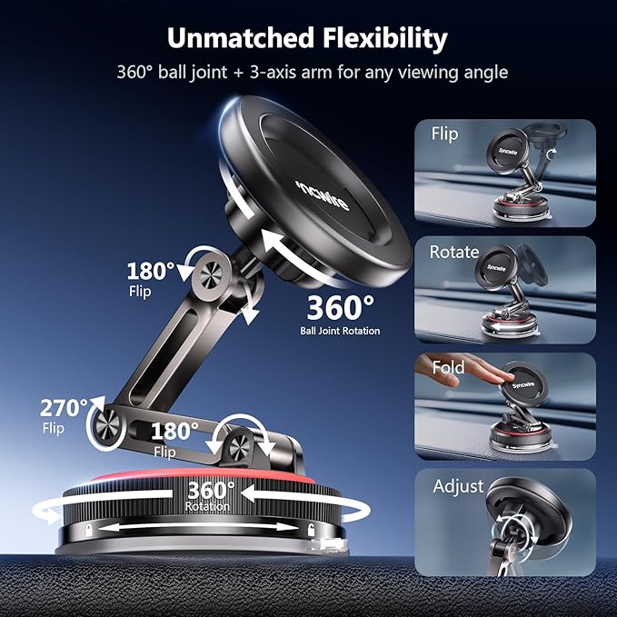 - Special Feature : 3-Axis Double Folding Arm + 360° Rotation - Total Flexibility, Heat-Dissipating Ring for Safer, Cooler Mounting, Heavy-Duty Suction Cup - Secure and Long-Lasting, Universal Use with Two Magnetic Rings Included, Upgraded N52 Dual Magnet Ring - Stronger Than Ever 3-Axis Double Folding Arm + 360° Rotation - Total Flexibility, Heat-Dissipating Ring for Safer, Cooler Mounting, Heavy-Duty Suction Cup - Secure and Long-… See more