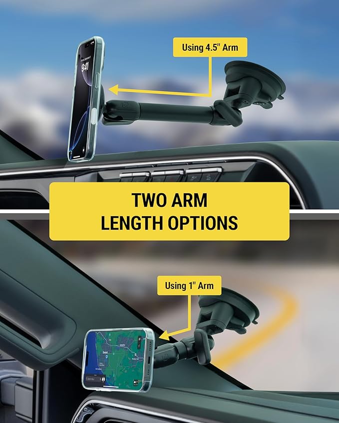 - Heavy Duty Magnetic Car Mount: Built for truckers & daily drivers, this phone mount is a perfect fit in any vehicle from a semi truck to SUV. This magnetic phone holder includes two extension arms (1" and 4.5") and upgraded N54 magnets 2.5x stronger than our standard MagicMount, ensuring your device stays secured in place