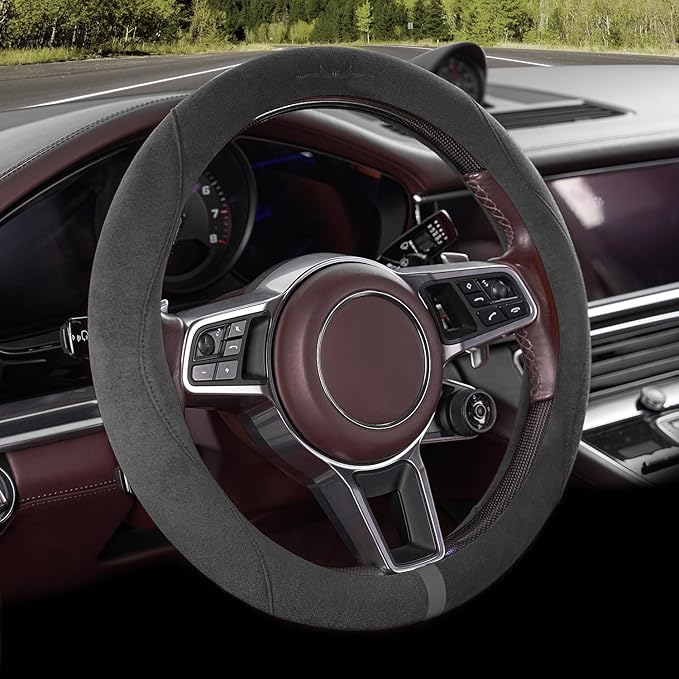OURTIME Faux Suede Car Steering Wheel Cover, Universal 15 inch,Non-Slip,Comfortable,Soft,Microfiber Breathable Suede Fabric,Warm in Winter and Cool in Summer (Gray)