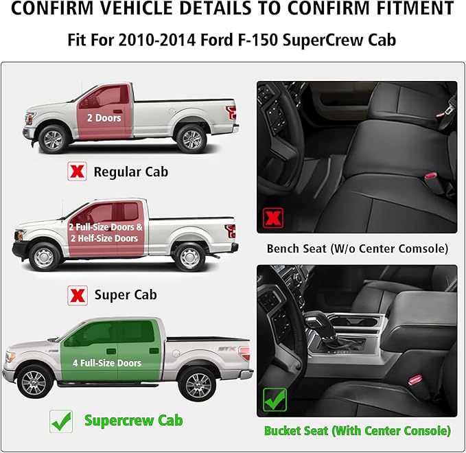 - FIT PERFECT: Adopt advanced 3D screening technology to capture every corner and crevice that it fits edge to edge and offers largest coverage. Aroppca floor mats compatible with 2010 2011 2012 2013 2014 Ford F150 SuperCrew cab with 1st row bucket seat. (Note: Rear liner requires designated trim for trucks with 1st row Bench Seat or optional Subwoofer)