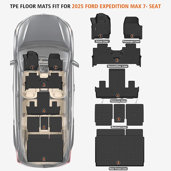 - PREMIUM TPE MATERIAL: Our all weather floor liners & trunk mat & backrest mat for 2025 Ford Expedition Max 7-Seater are made of non-toxic, odorless, flexible, and high-strength TPE material, ensuring safety even in extreme hot weather. Keep you and your family healthy in the car