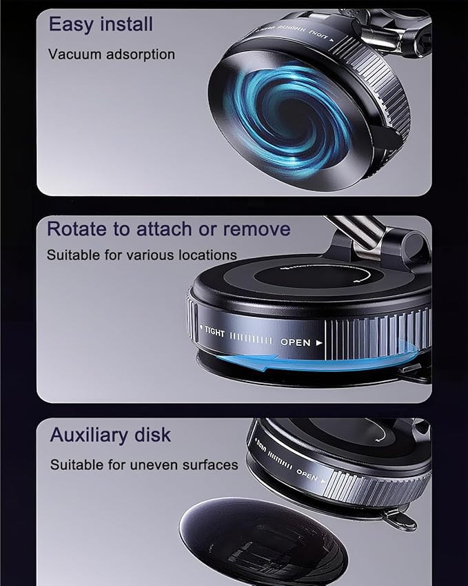 - SLAP IT ON & GO – 3-SEC SETUP, NO RESIDUE ! > Vacuum base sticks to ANY surface (leather/plastic/tinted glass). Rotation → PSSHT! → Done. Peel off clean – unlike those nasty glue pads
