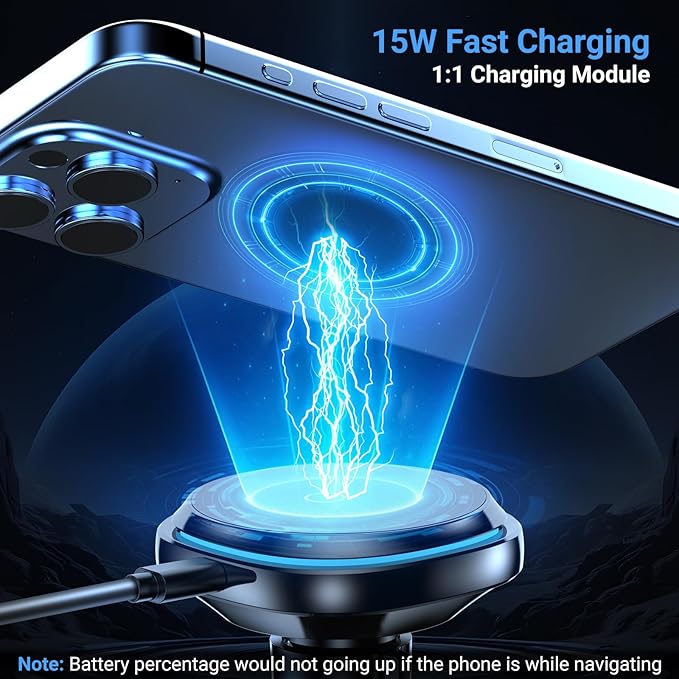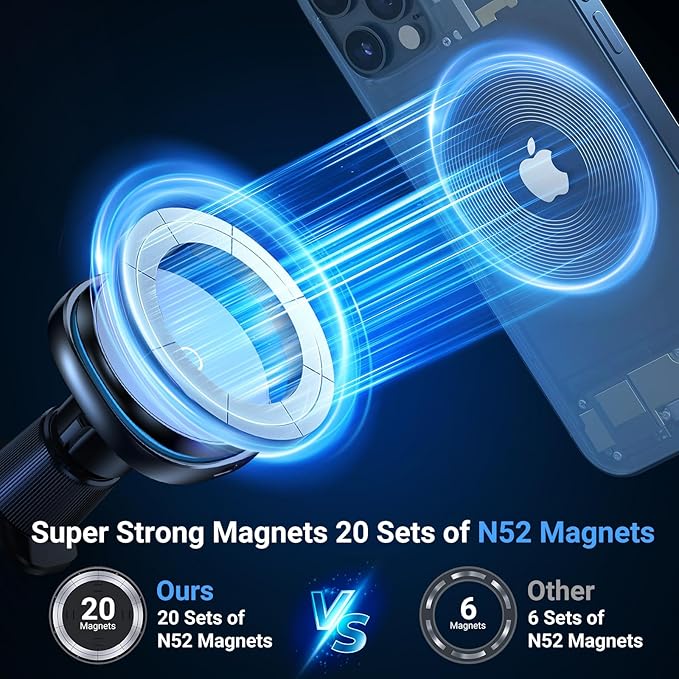 - 【360° Flexile & One Hand Operation】: iPhone car mount features flexible adjustments. It features a 360-degree swivel ball joint , allowing you to easily adjust the angle of your phone without blocking your view! Ensures easy hands-free driving with less distractio and rotates up and down for unlimited viewing angles. Whether you're GPS navigating or charging and make calls, the car cell phone holder provides a safer driving experience. Note:If you use a case, please stick the metal ring to get strong magnet power.