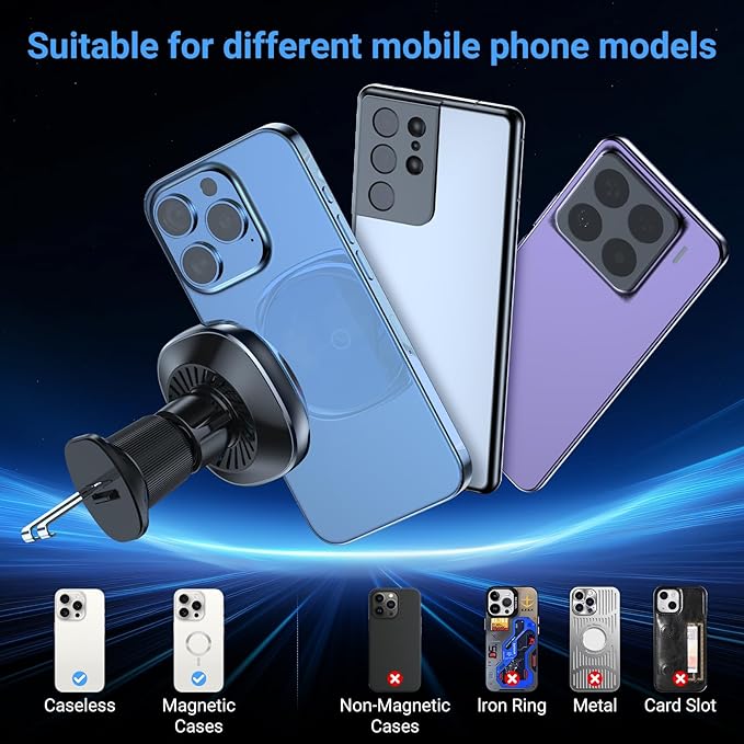 - 【Important Usage Notice】6.iPhone Compatibility - Wireless charging is only available for iPhone 12 and newer models.7.Android Requirements - Your Android device must have built-in magnetic compatibility (check your phone's specifications).8.Using Phone Cases - For best results with cases, always use the included magnetic ring to ensure strong attachment.9.Adjusting Position - When changing the mount's position, hold the vent blades steady with one hand while adjusting with the other to prevent damage.Please Note: We strongly recommend confirming compatibility with your specific vehicle and phone model before purchasing. Following these guidelines will ensure optimal performance and safety.