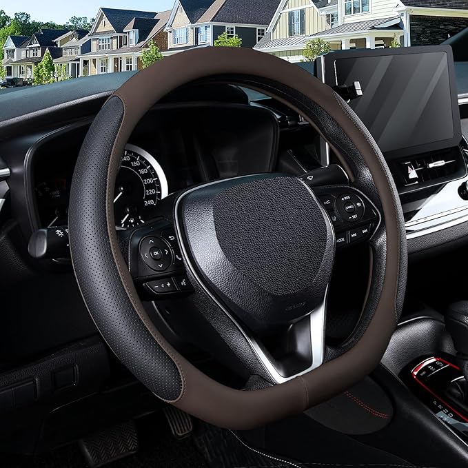 SEG Direct D Shaped Steering Wheel Cover for 14.5-15 inch Flat Bottom Wheels, Breathable Perforated Microfiber Leather, Anti-Slip Grip, Universal Fit for Cars & SUVs, Black and Brown