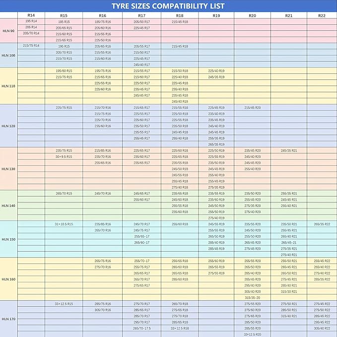 - Widely Compatible - Model HLN 160 anti-slip chain compatible sizes: 265/70 R16, 265/75-16, 275/70 R16, 255/70-17, 255/75-17, 265/65 R17, 265/70 R17, 275/65-17, 255/65 R18, 265/60 R18, 265/65-18, 255/70-18, 255/60-19, 265/55-19, 275/55-19, 255/55 R20, 265/50 R20, 265-55-20, 275/50 R20, 285/40 R20, 285/45-20, 305/40 R20, 315/35-20, 265/45-21, 275/45 R21, 285/40 R21, 285/45 R21, 295/40 R21, 315/30 R21, 315/35 R21, 255/45 R22, 265/40 R22, 275/40 R22, 285/35 R22(Please refer to the vehicle manual). Snow chains can only be used for vehicle manufacturer-approved tire sizes.
