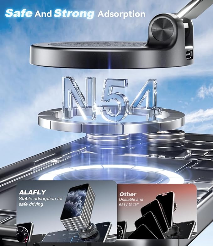 - 【Strong Magnetic Attraction】Built-in powerful N54 magnets provide formidable holding force that securely adsorption your phone during bumps, sharp turns. and even emergency braking. Effectively prevents falls and distractions, ensuring you can focus on safe driving