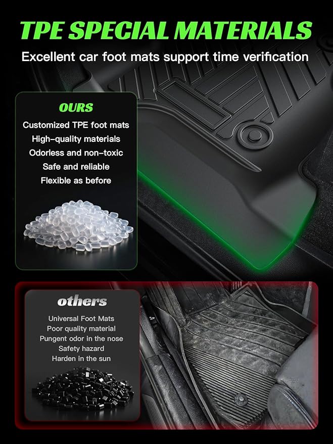 - 【TPE Material 】Our car floor mats are made of TPE (Thermoplastic Elastomer) material, which is 100% recyclable, odorless, non-toxic, wear-resistant and durable. Our floor liners for Jeep Gladiator features high heat resistance and flexibility, capable of adapting to all kinds of extreme weather conditions. There is no need to worry about the car mats cracking, curling or splitting, ensuring a safe and comfortable driving environment for you and your family.