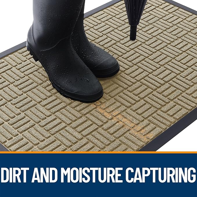 - [CAPTURES DIRT AND MOISTURE] The surface of the OLANLY door mat is made of woven polyester fabric featuring deep grooves to effectively trap dust, mud, and debris. The sturdy, beveled rubber edge prevents water pooling, ensuring a dry, clean entrance even in rainy or snowy conditions.