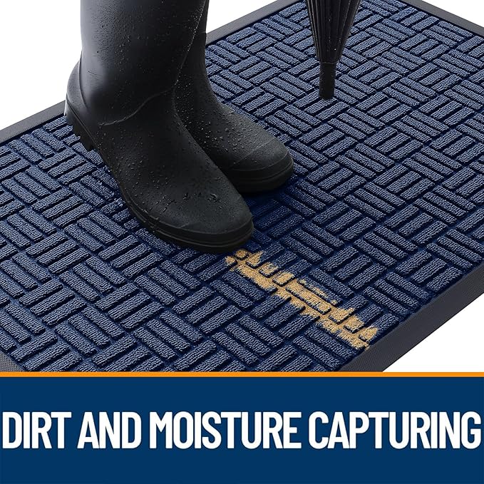 - [CAPTURES DIRT AND MOISTURE] The surface of the OLANLY door mat is made of woven polyester fabric featuring deep grooves to effectively trap dust, mud, and debris. The sturdy, beveled rubber edge prevents water pooling, ensuring a dry, clean entrance even in rainy or snowy conditions.