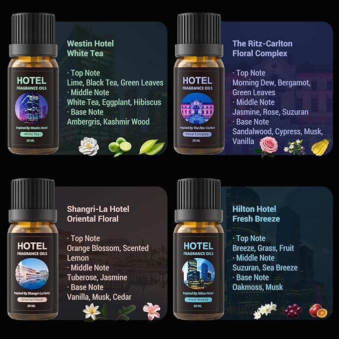 - Essential oil set: includes 4*20ml hotel-grade essential oil sets