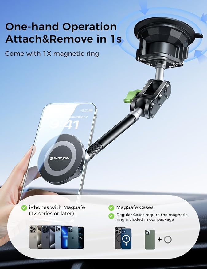 - [Designed for MagSafe] 2025 MAGIC JOHN Best iPhone car mount is designed for iphone 16/15/14/13/12 series and official MagSafe cases and other magnetic phone cases and can be fixed directly to these phones without the need to affix metal plates. All Android Phones Will Work: Metal rings are provided; they fit cases and other phones without MagSafe.