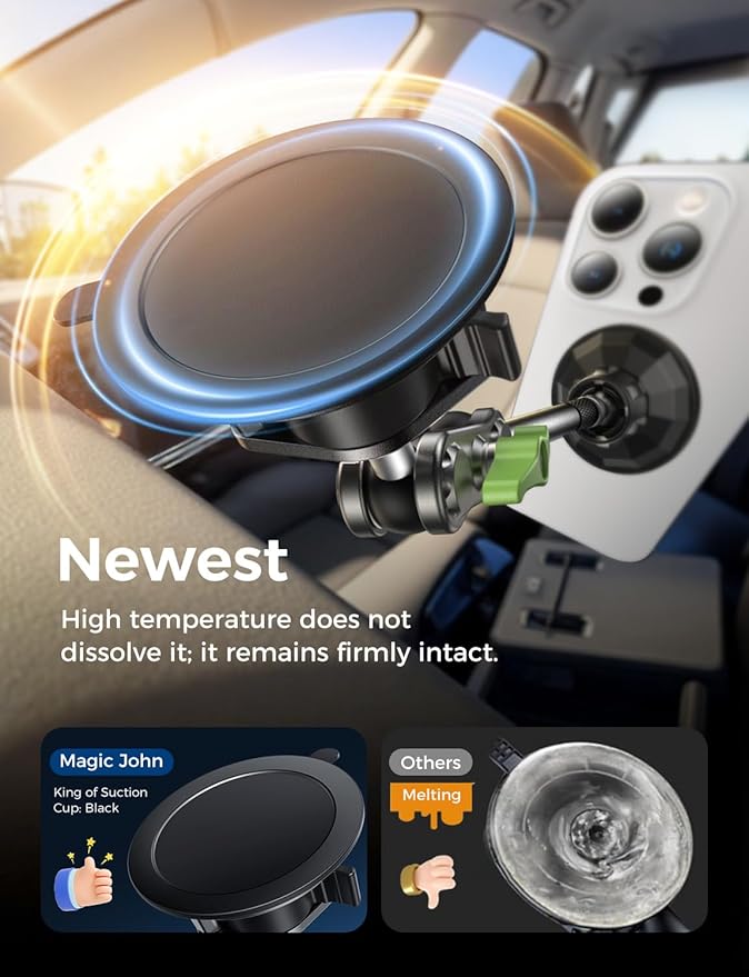 MAGIC JOHN Magnetic Car Phone Holder [Strong Suction&Strong Magnetic] 360° Adjustable Car Phone Mount for Windshield, Ultra-Durable Metal, Suction Cup Car Phone Mount for iPhone Samsung All Smartphone