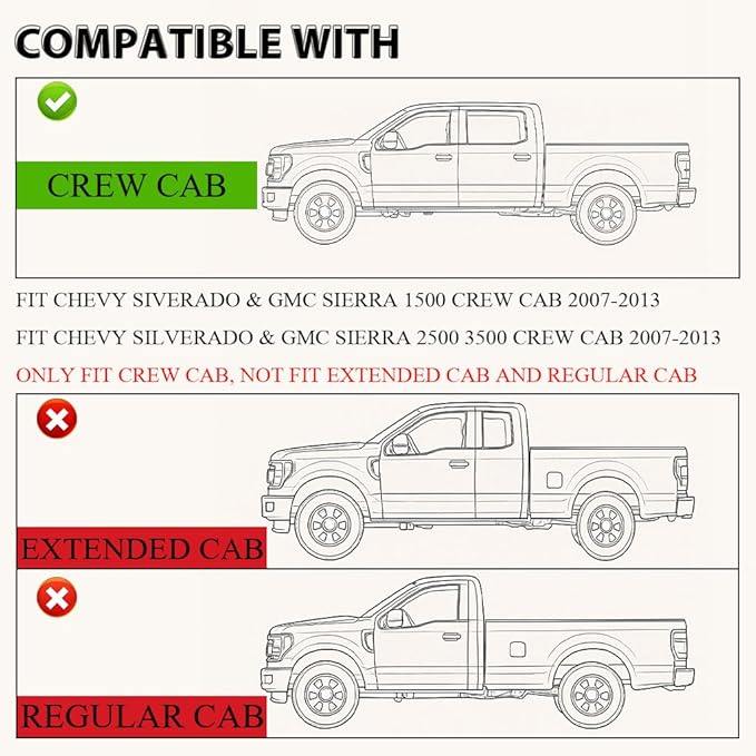 - Vehicle Compatibility - Compatible with Chevy Silverado & GMC Sierra 1500 Crew Cab 2007-2013, Compatible with Chevy Silverado & GMC Sierra 2500 3500 Crew Cab 2007-2014
